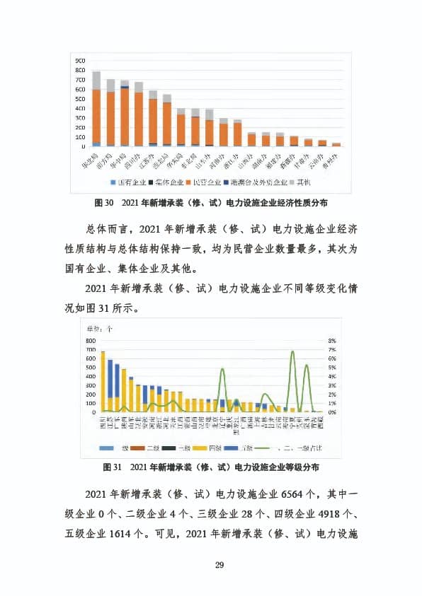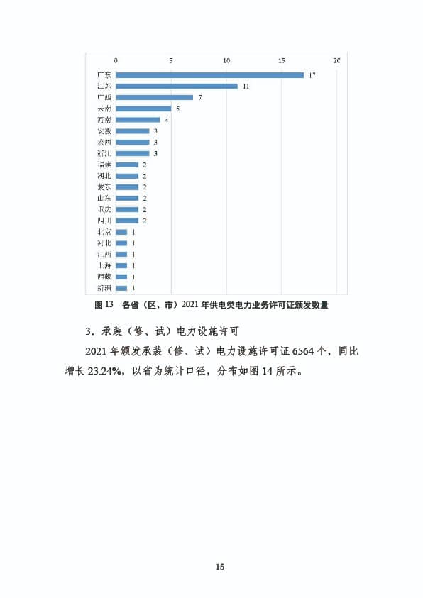 持证发电企业数量稳健增长,输电、供电企业数量保持稳定,承装(修、试)电力设施企业数量较快增长。截至 2021 年底,全国持有电力业务许可证企业共有15722 家。全国持证承装(修、试)电力设施企业共有31609家,较2020 年增加 6079 家,增长率为24%,新增持证企业中,民营企业占比达87%。
