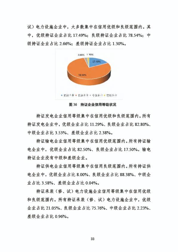 市场主体结构与规模变化各具特色,新能源成为发电装机增长的主力,承装(修、试)电力设施企业综合能力稳步提升。持证发电企业总装机容量为2067237MW。持证可再生能源企业装机占比快速提高,新增持证风电、太阳能装机容量 74803MW,已超过火电新增装机容量(57023MW),占持证企业全年新增总装机容量的近 50%,许可管理有效促进发电行业持续转型升级。从承装(修、试)电力设施企业许可等级分布看,四级企业占比最大,达60%。承装、承修、承试 3 个许可类别间的业务关联性较强,同时持有3 个类别许可的企业占比达到86%,占比进一步提高。