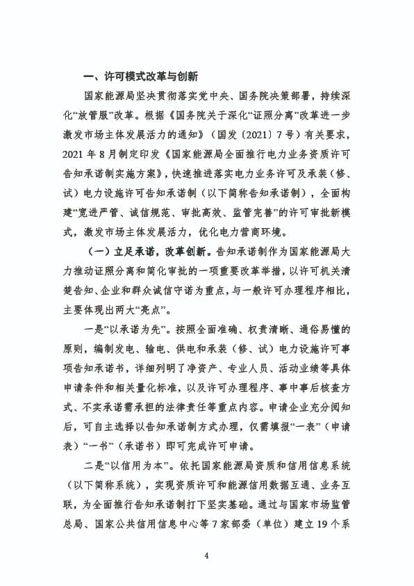创新许可模式,深化“放管服”改革,电力业务资质许可告知承诺制实施效果明显。2021 年国家能源局全面推行电力业务资质许可告知承诺制,以“三减”措施实现“三零”成效,制度成本有效降低,营商环境明显改善。从 2021 年 8 月 26 日至2021 年底,全国以告知承诺制方式办理电力业务资质许可的发电、输电、供电及承装(修、试)电力设施企业数量累计达3196家,占当期办理业务总量的41%。