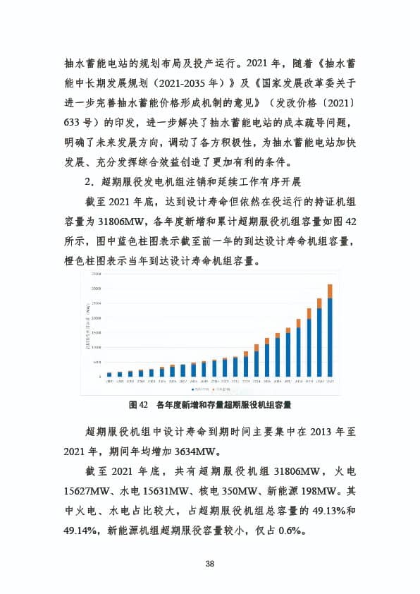 增量配电业务许可工作稳步推进,超期服役机组许可管理工作持续加强。2021 年,新增持证增量配电项目36 个,全部为试点项目。截至 2021 年底,增量配电业务累计取证数量为 213 个。第一批至第五批增量配电试点项目合计459 个,取证试点项目占比达 42%。2021 年,各派出机构对超期服役机组分类施策,符合产业政策、环保、能耗要求的机组,经安全评估后,准予延续运行,充分发挥其经济性优势;不符合产业政策,环保排放、运行参数不达标的机组及时注销许可证。2021 年,各派出机构共许可8191MW 机组延续运行,注销1602MW 达到设计寿命机组许可证。